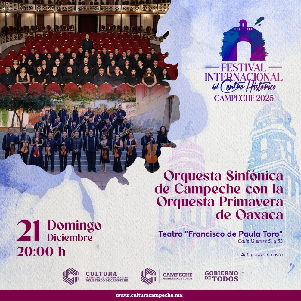 Las actividades de clausura continuarán el domingo 21 de diciembre a las 20:00 horas en el Teatro «Francisco de Paula Toro» con la presentación conjunta de la Orquesta Sinfónica de Campeche y la Orquesta Primavera de Oaxaca, concierto sinfónico que reúne a ambas orquestas en una colaboración que exalta el talento musical del sureste.