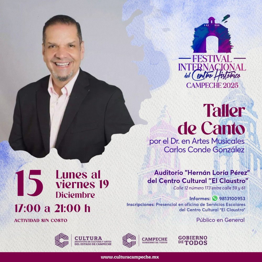 La programación inicia este lunes 15 de diciembre con el Taller de Canto impartido por el Dr. en Artes Musicales Carlos Conde González de 17:00 a 21:00 horas en el Auditorio «Hernán Loría Pérez» del Centro Cultural «El Claustro», actividad formativa orientada al perfeccionamiento de la técnica vocal que se extenderá hasta el viernes 19 de diciembre en el mismo horario.