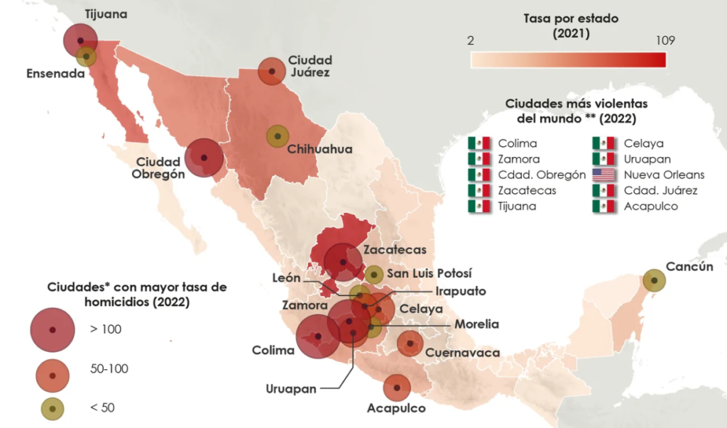 Información aportada por Omar García Harfuch, secretario de Seguridad Ciudadana, indica que según el Secretariado Ejecutivo del Sistema Nacional de Seguridad Pública (SESNSP) 25.3% de los homicidios violentos están registrados en los siguientes 10 municipios: Colima, Colima; Tijuana, Baja California; Acapulco, Guerrero; Celaya, Guanajuato; Cajeme, Sonora; Ciudad Juárez, Chihuahua; Tlajomulco de Zúñiga, Jalisco; Chihuahua, Chihuahua; León, Guanajuato; Benito Juárez, Quintana Roo.