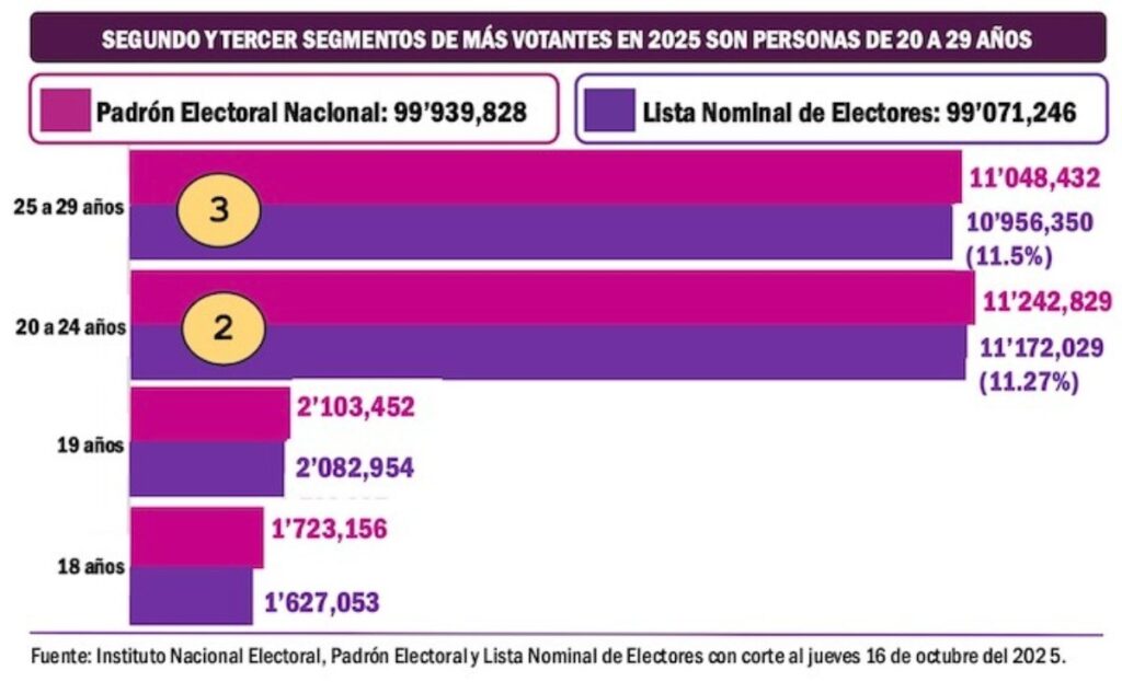 De una lista nominal de 99 millones de electores en 2025, las personas de 65 años y más llegaron a 13.5 millones, que representan el 13.6%. Mientras que las de 20-24 años son 11.1 millones con 11.2% de la lista nominal.