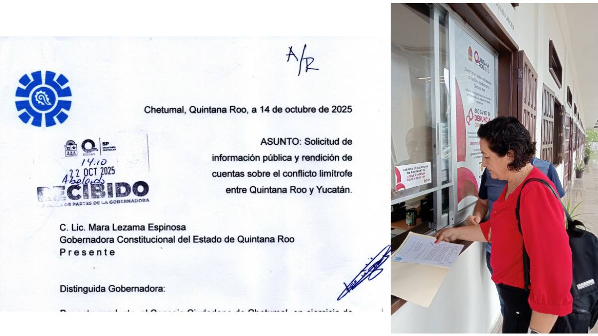 Este 22 de octubre entregaron de manera oficial una carta dirigida a la gobernadora Mara Lezama Espinosa “solicitando información pública y rendición de cuentas sobre el conflicto limítrofe entre Quintana Roo y Yucatán” derivado del conflicto territorial original con Campeche, que estalló durante los gobiernos de Mario Villanueva Madrid y Jorge Salomón Azar García, cuando éste creó el municipio de Calakmul.