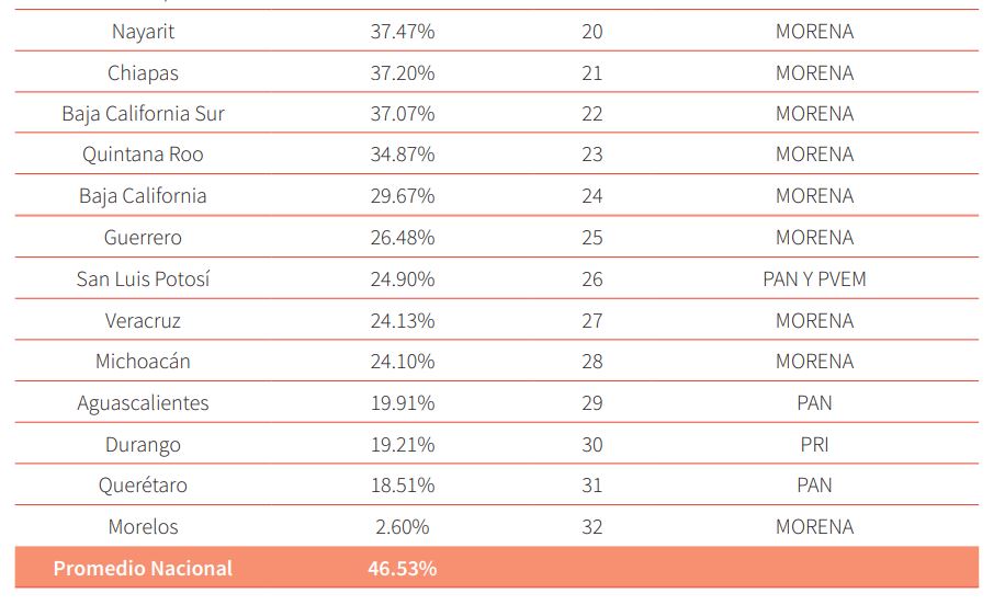 Su calificación entre las 32 entidades federativas es de 34.87%, ocupando el lugar 23 en el ranking nacional de esta metodología.