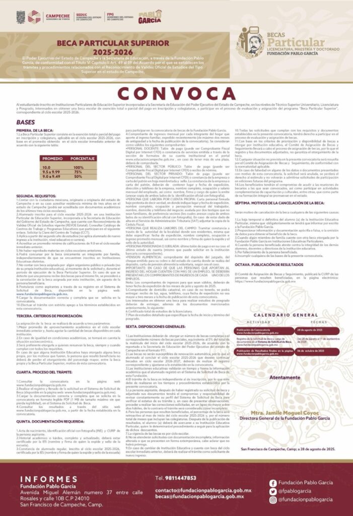 Con el objetivo de apoyar a estudiantes campechanos inscritos en instituciones particulares de Educación Superior incorporadas a la Secretaría de Educación, la Fundación Pablo García abrió la convocatoria para la Beca Particular Superior 2025-2026.