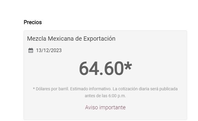 En tanto, el Centro de Estudios de las Finanzas Públicas (CEFP) de la Cámara de Diputados federal manifestó que “al ocho de diciembre, el precio de la mezcla mexicana promedió 71.40 dólares por barril, colocándose 2.70 dólares (3.93 por ciento), por arriba de lo aprobado en los Criterios Generales de Política Económica 2023 (68.70 dólares por barril)”.