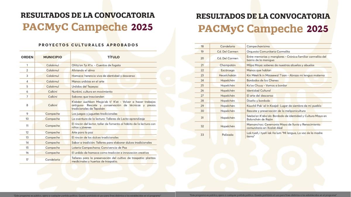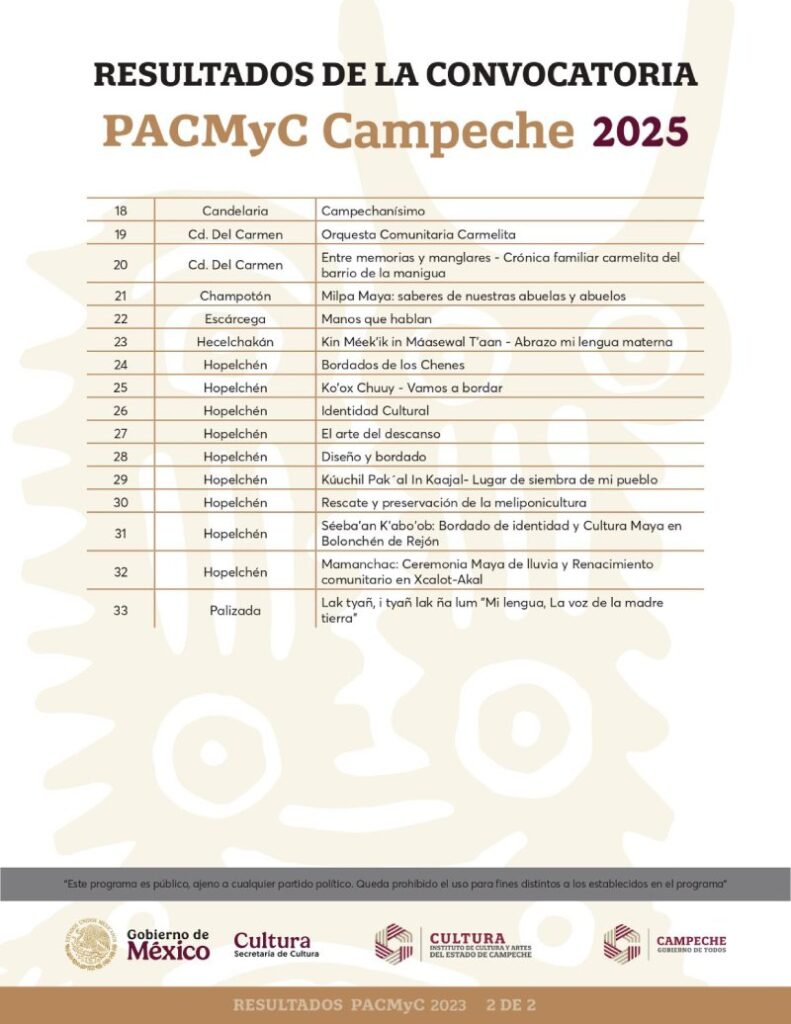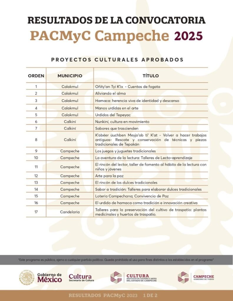 El Instituto de Cultura y Artes del Estado de Campeche (ICAECAM) dio a conocer los resultados oficiales de la convocatoria del Programa de Acciones Culturales Multilingües y Comunitarias (PACMyC) 2025, resultado de un esfuerzo coordinado entre el Gobierno Federal y el Gobierno del Estado de Campeche, cuyo objetivo principal es fomentar y preservar el patrimonio cultural inmaterial de nuestra región mediante el apoyo directo a iniciativas locales.
