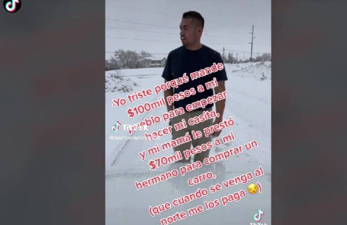 «Yo triste porque mande 100 mil pesos a mi pueblo para empezar a hacer mi casita y mi mamá le prestó 70 mil pesos a mi hermano para comprar un carro (que cuando se venga al norte me los paga)», escribió el joven en el video.