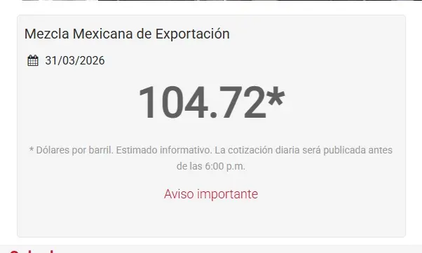 CIUDAD DEL CARMEN, Cam. 31 de marzo del 2026.- El precio del crudo mexicano de exportación siguió subiendo y se ubicó la tarde de este martes en 104.72 dólares por barril.