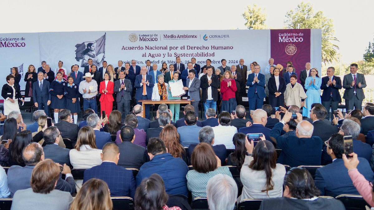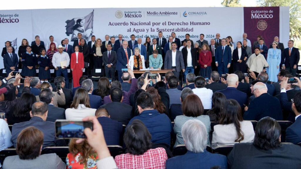 La Presidenta de México, Claudia Sheinbaum Pardo, firmó el Acuerdo que une a empresarias, empresarios, instituciones académicas, así como a los 32 gobernadores y gobernadores para garantizar el agua como un bien nacional y un derecho de todas y todos los mexicanos, esto como parte del Plan Nacional Hídrico 2024-2030.
