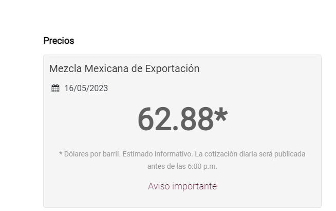 CIUDAD DEL CARMEN, Cam. 16 de mayo del 2023.- Este martes 16 de mayo, el crudo mexicano de exportación se mantuvo casi en el mismo precio del lunes.