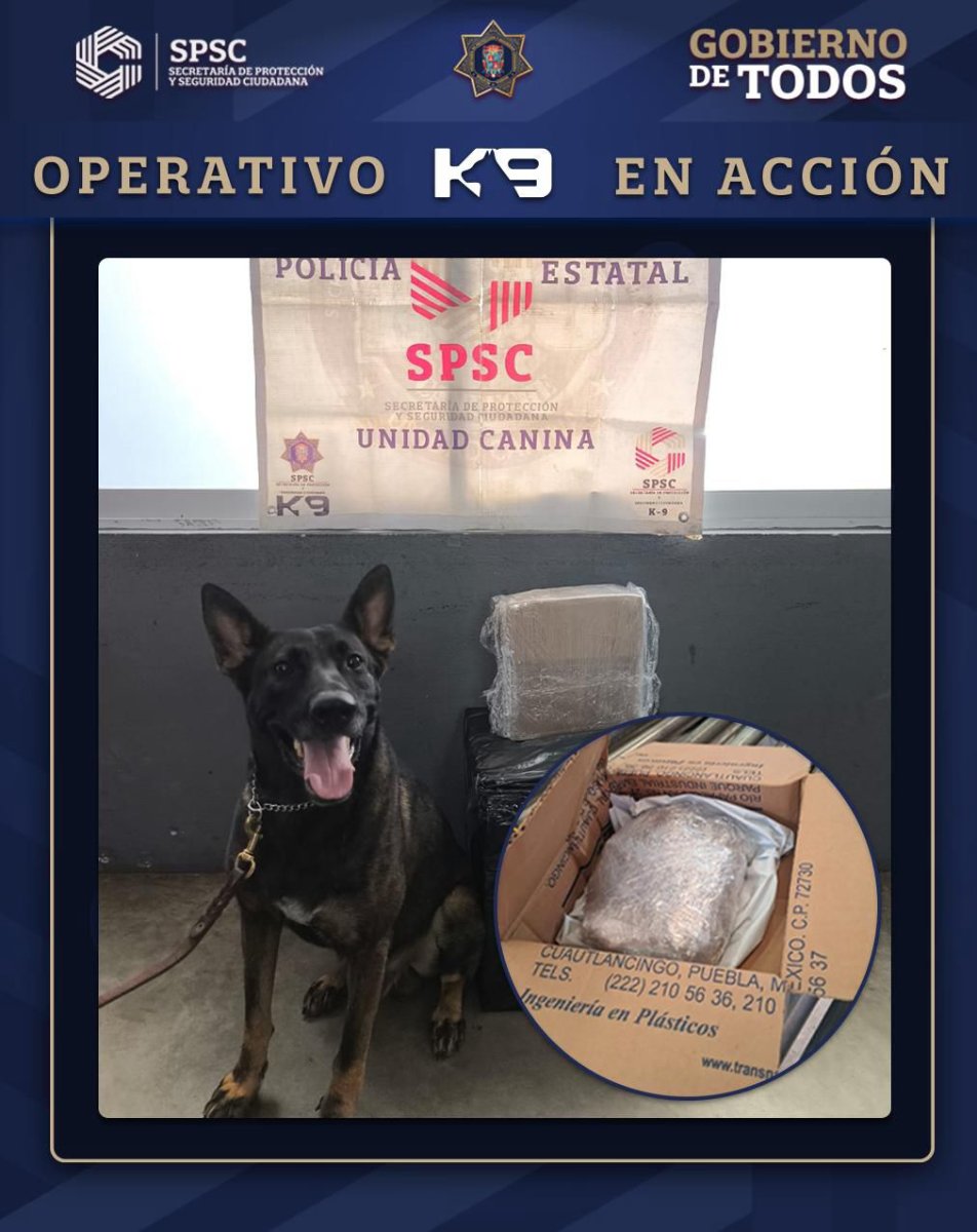 Durante la verificación, el binomio canino de la SPSC marcó de manera positiva un paquete. Al abrirlo, y en presencia del personal autorizado, se encontró material con características de posibles sustancias ilícitas.