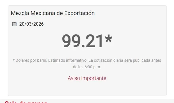 CIUDAD DEL CARMEN, Cam. 20 de marzo del 2026.- El crudo mexicano de exportación cerró la semana en casi 100 dólares por barril, dio a conocer la empresa Petróleos Mexicanos.