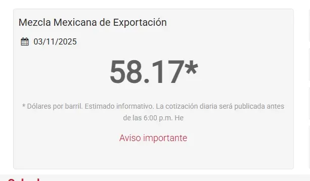 CIUDAD DEL CARMEN, Cam. 3 de noviembre del 2025.- Al iniciar el mes de noviembre, el precio del crudo mexicano de exportación volvió a perder y se colocó la tarde de este lunes en 58.17 dólares por barril.