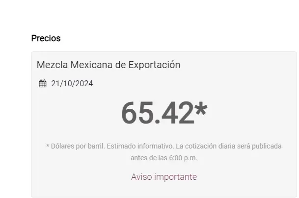 En tanto, el Centro de Estudios de las Finanzas Públicas (CEFP) de la Cámara de Diputados federal manifestó que “al 18 de octubre, el precio de la mezcla mexicana promedió 72.05 dólares por barril, cifra 15.35 dólares (27.08 por ciento) por arriba del aprobado en los Criterios Generales de Política Económica 2024 (56.70 dólares por barril)”.