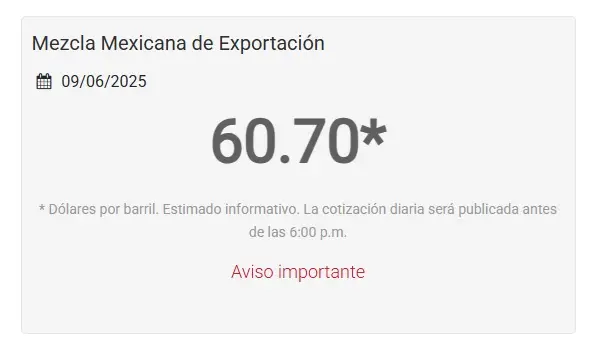 CIUDAD DEL CARMEN, Cam. 9 de junio del 2025.- El crudo mexicano de exportación inició la semana al alza, al cotizarse en 60.70 dólares el barril, informó la empresa Petróleos Mexicanos.