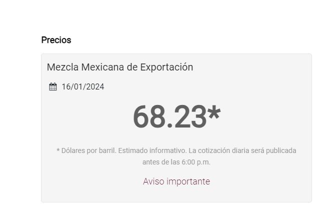 CIUDAD DEL CARMEN, Cam. 16 de enero del 2024.- El petróleo mexicano abrió la tercera semana de enero con un precio casi similar al del viernes pasado, a 68.23 dólares por barril, dio a conocer la empresa Petróleos Mexicanos.