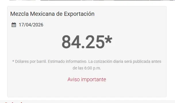 CIUDAD DEL CARMEN, Cam. 17 de abril del 2026.- En esta guerra de altibajos, el barril del petróleo mexicano volvió a bajar de precio y se colocó la tarde de este viernes en 84.25 dólares.