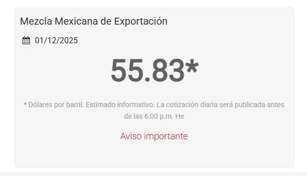 En tanto, el Centro de Estudios de las Finanzas Públicas (CEFP) de la Cámara de Diputados federal manifestó que “al 26 de noviembre, el precio de la mezcla mexicana promedió 62.20 dólares por barril, cifra 4.40 dólares (7.6 por ciento) por arriba de la estimación de la Secretaría de Hacienda y Crédito Público en los Criterios Generales de Política Económica 2025 (57.80 dólares por barril)”.