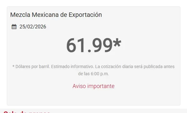 CIUDAD DEL CARMEN, Cam. 25 de febrero del 2026.- La tarde de este miércoles, el precio del barril del crudo mexicano de exportación se mantuvo por encima de los 60 dólares, al ubicarse en 61.99 dólares.