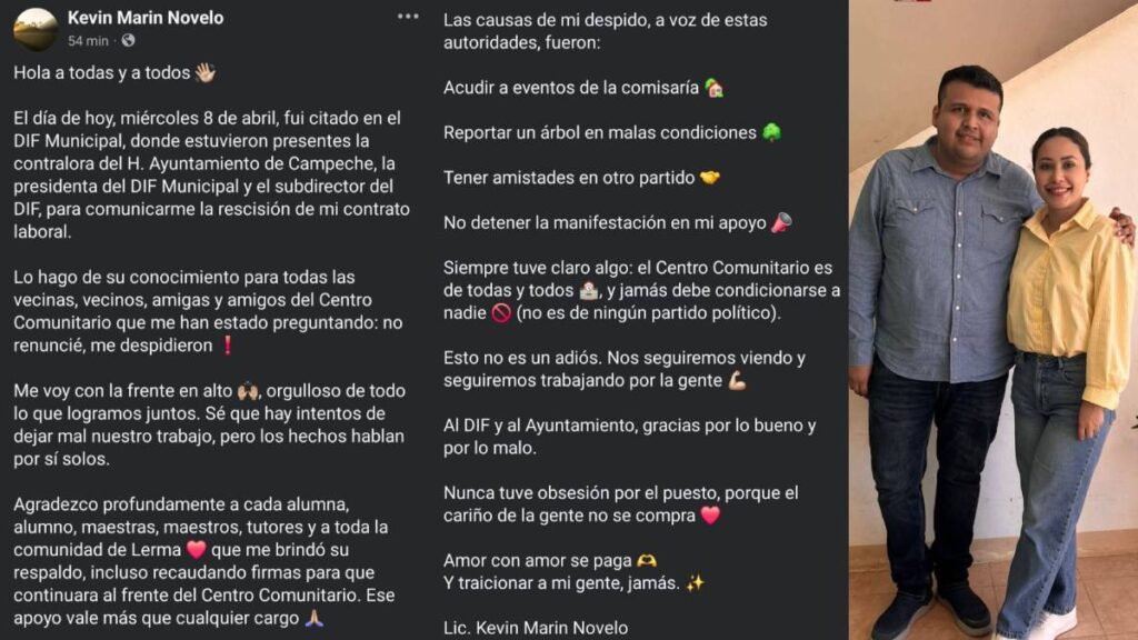 El afectado señaló que la presidenta del Sistema DIF Municipal de Campeche, Thiare Hernández, le notificó la cancelación de su contrato. Además, acusó que autoridades cambiaron candados y cerraduras para impedirle realizar la entrega formal del cargo y las instalaciones.