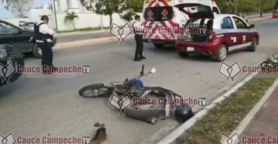 La familia a bordo de una motocicleta y la unidad de taxi marcada con el número económico 205 de la agrupación Élite, les terminó cerrando la circulación, originando que los tripulantes del biciclo, entre ellas una menor de edad, cayeran al suelo.