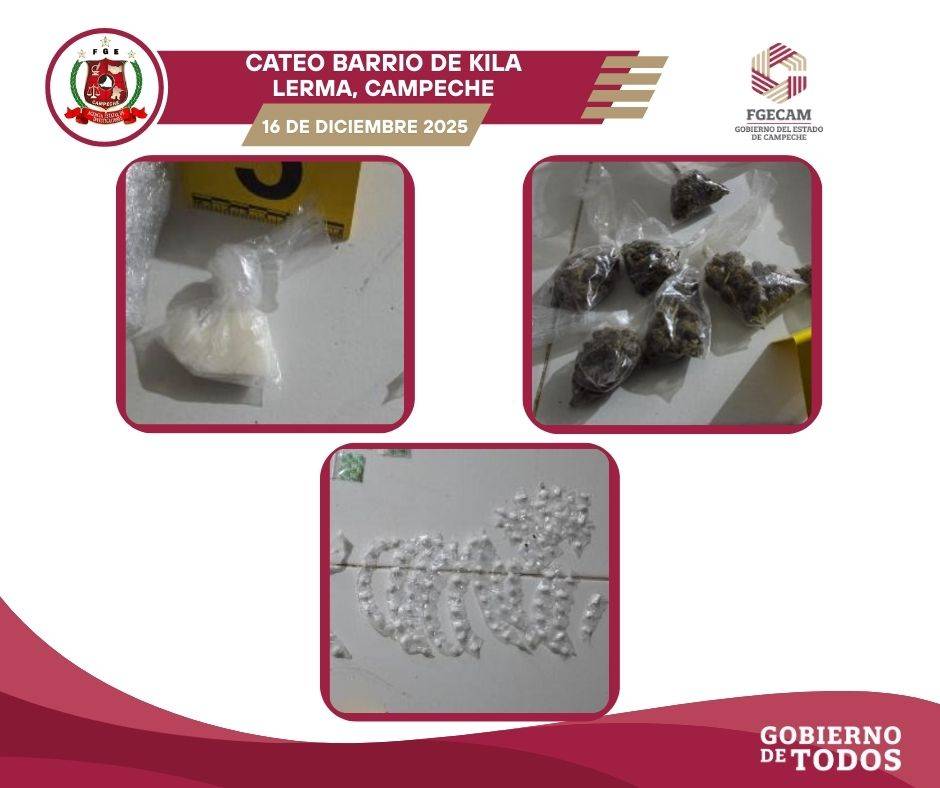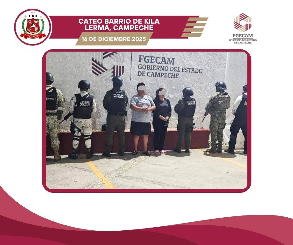 El primer cateo se efectuó en un inmueble ubicado en la calle Lázaro Cárdenas, del barrio de Kila, en la comunidad de Lerma, Campeche, donde fueron detenidas dos personas adultas identificadas como A.C.V., hombre de 44 años de edad, y E.M.P.C., mujer de 39 años de edad.}