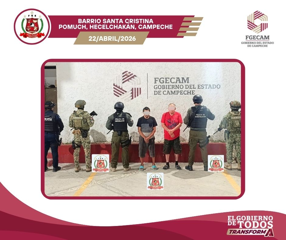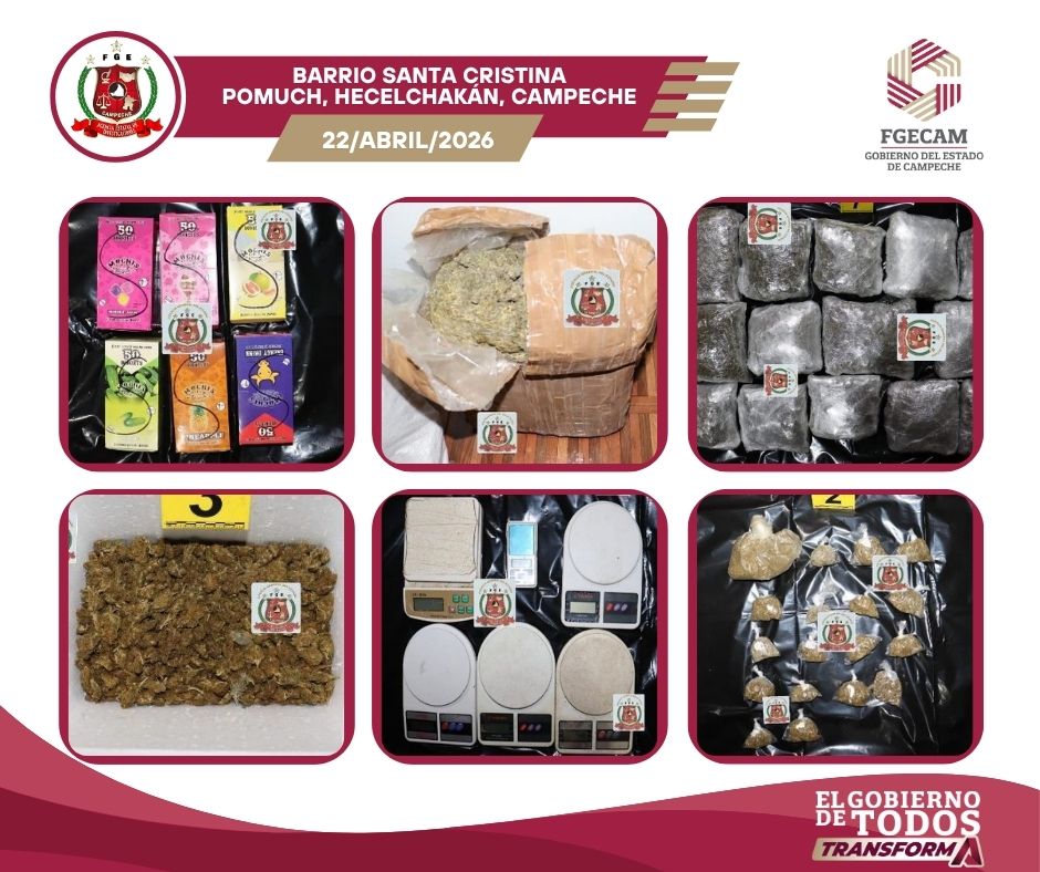 La Fiscalía General del Estado de Campeche (FGECAM) informa que elementos de la Agencia Estatal de Investigaciones, adscritos a la Fiscalía Especializada en el Combate al Delito de Narcomenudeo, aseguraron a dos personas, así como sustancia ilícita, básculas grameras, numerario y diversos objetos, durante el cateo de un predio ubicado en el barrio de Santa Cristina, en la localidad de Pomuch, municipio de Hecelchakán.