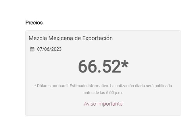 El lunes, el Centro de Estudios de las Finanzas Públicas (CEFP) de la Cámara de Diputados federal informó hoy que al primero de junio, “el precio de la mezcla mexicana promedió 66.22 dólares por barril, colocándose 2.48 dólares (menos 3.61 por ciento) por debajo de lo aprobado en los Criterios Generales de Política Económica 2023 (68.70 dólares por barril)”.