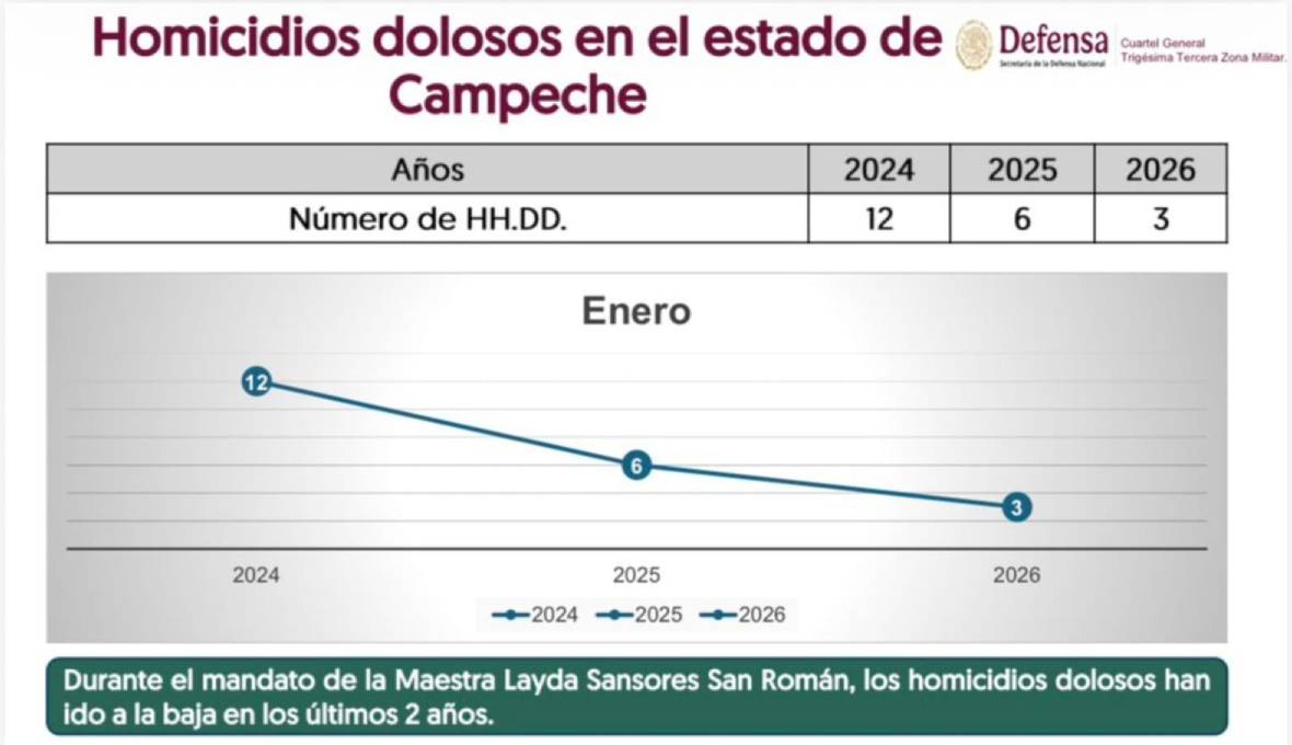 Los índices delictivos, en especial los homicidios dolosos, registran una tendencia a la baja en el país y en Campeche, reportó la gobernadora Layda Sansores a través de sus redes sociales.