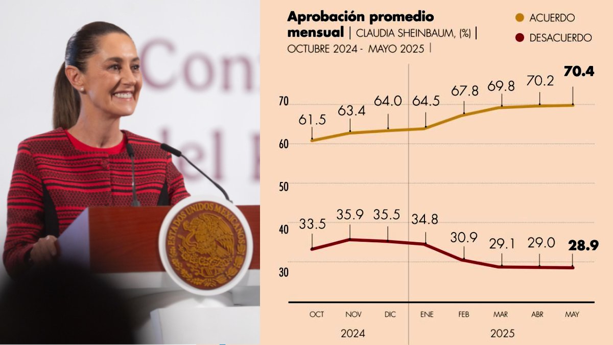 En mayo pasado, la presidenta Claudia Sheinbaum alcanzó la aprobación promedio más alta de los ocho meses que lleva en el cargo: 70.4%; la cifra, que ha ido en aumento desde que asumió el cargo, es 8.9% superior a la registrada en octubre de 2024.