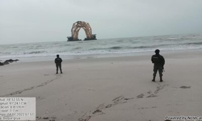 El buque grúa Versamar VB-10000, varado en las inmediaciones de Sabancuy debido al mal tiempo, propiedad de la empresa Harren and Partner, está siendo ya rescatado...