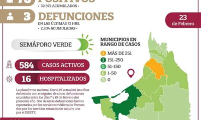 o 78 casos positivos nuevos. o 32 mil 973 casos positivos acumulados. o 584 casos activos. o 8 municipios con casos activos. Se registran tres defunciones...