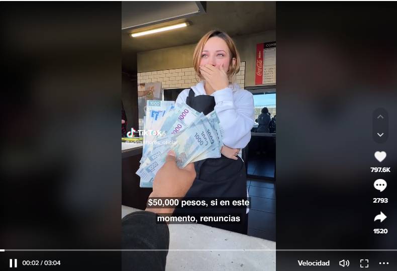 ¿De qué se trata? De acuerdo con lo que se muestra en las imágenes, dicho tiktoker, transitando por las calles, ofreció la cantidad de 50 mil pesos a una mesera; sin embargo, esta tenía que aceptar un reto: renunciar a su trabajo.