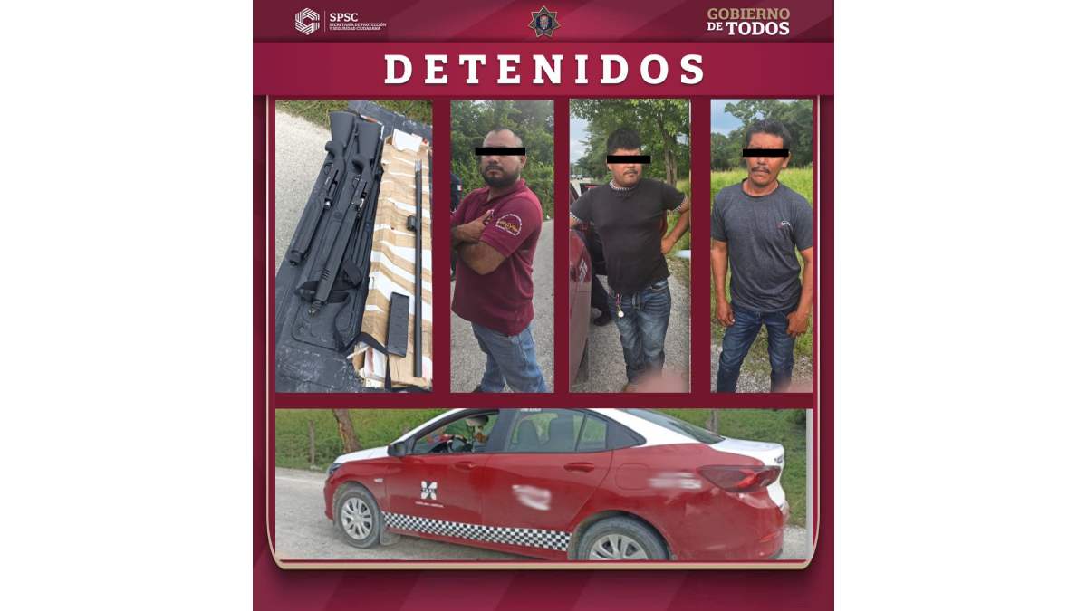 Durante estas acciones, se identificó un taxi con placas de Campeche y se marcó el alto para su revisión; al entrevistarse con los ocupantes y proceder a la inspección, se localizó en el interior del vehículo una caja de cartón envuelta con cinta adhesiva, que resguardaba dos escopetas.