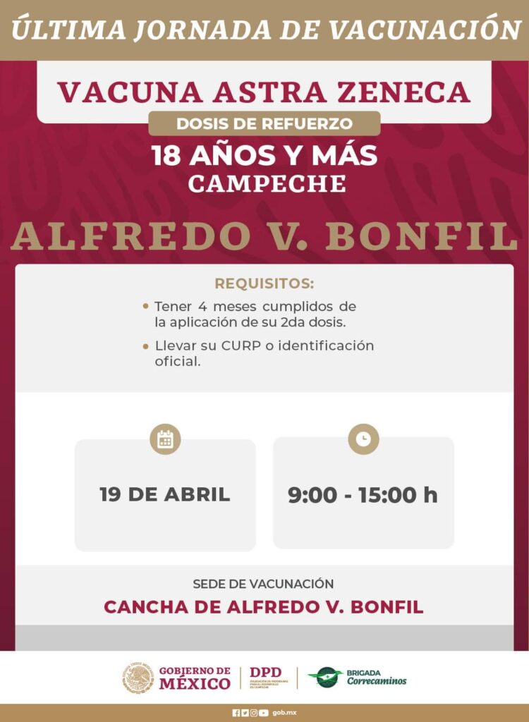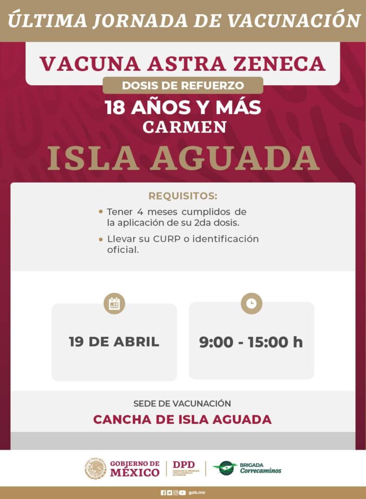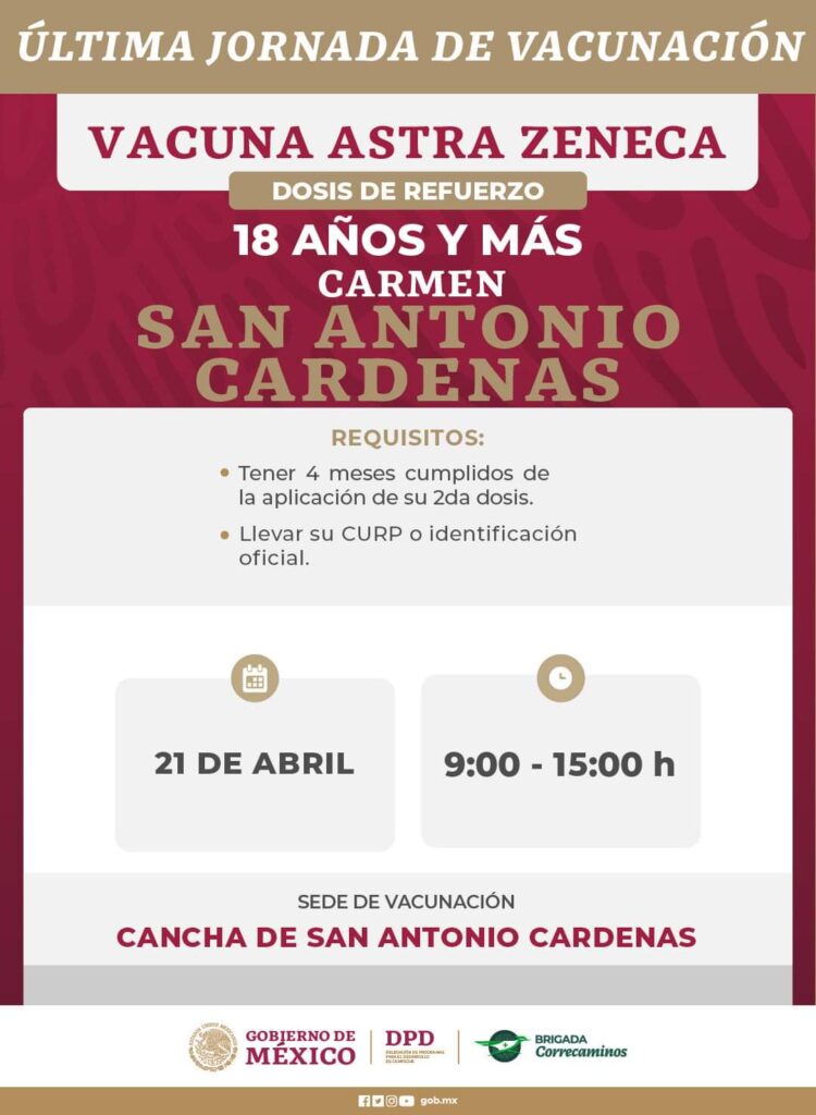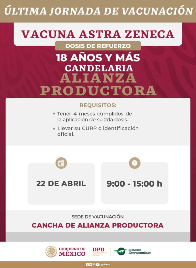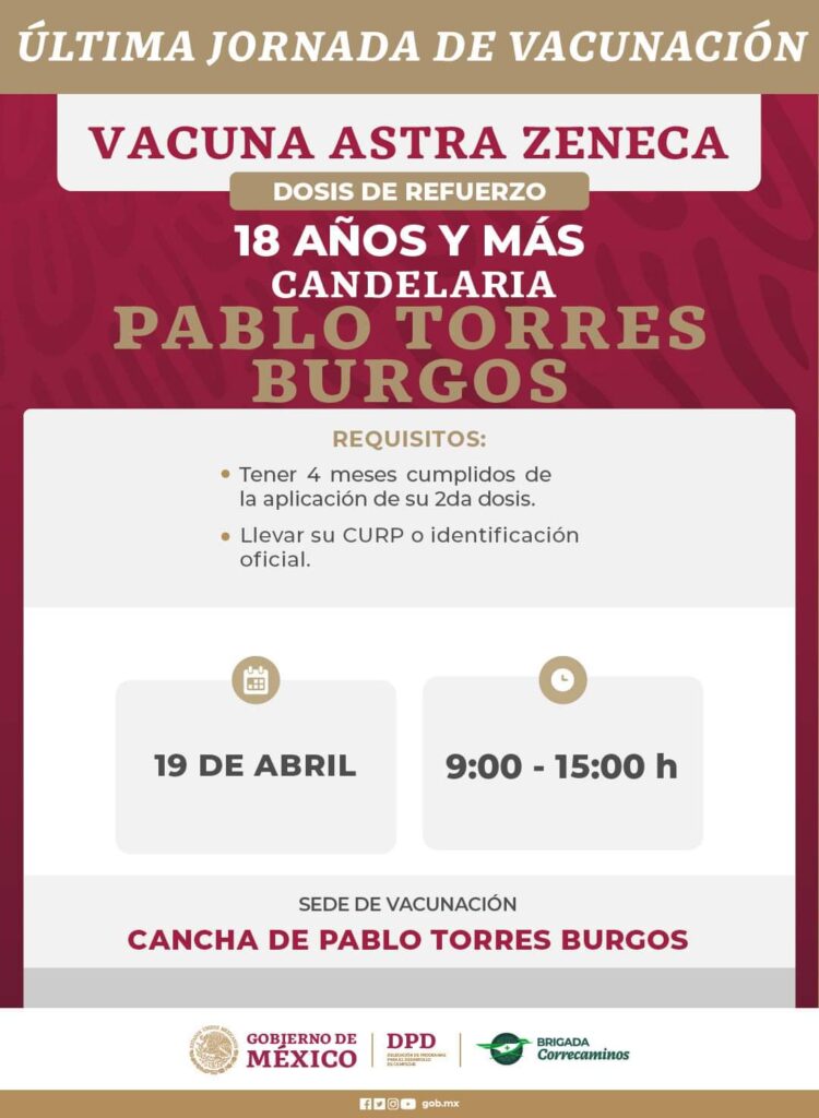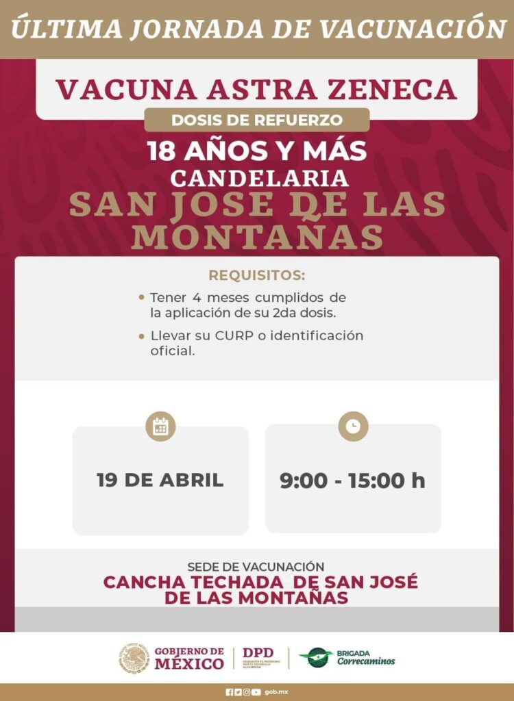 Anuncian última jornada de aplicación de dosis contra Covid-19 que se llevará a cabo del 18 al 22 de abril en localidades de los municipios: